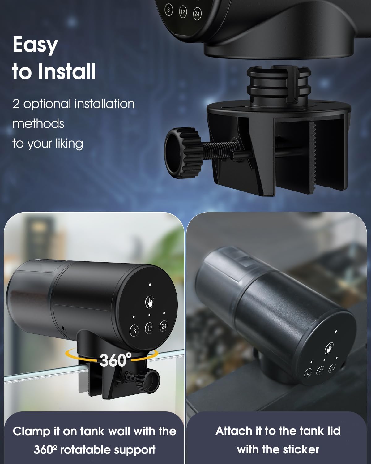 The Qpets Fish Tank Automatic Fish Feeder provides a reliable way to feed aquarium fish at home with a 200ml large-capacity container and adjustable feeding modes. It features three preset automatic schedules at 8, 12, or 24 hours, along with manual operation for flexible feeding. The adjustable feeding volume helps prevent overfeeding, while the upgraded moisture-proof lid protects food from humidity and clumping. Designed with two installation options and a 360° rotating base, it fits various aquarium types securely. Suitable for different kinds of fish food including flakes, granules, and powders, this Qpets feeder ensures consistent feeding convenience and supports healthy fish care during daily routines or travel.