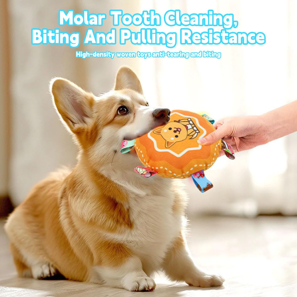 - Multiple fabric tabs offer varied textures and make it easy for pets to grip and toss.