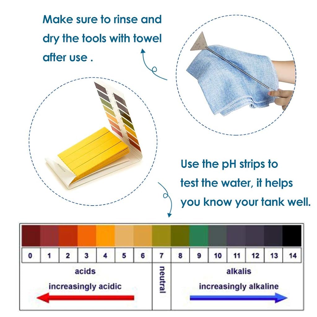 • SERVICE WARRANTY: Your satisfaction is our lifetime goal. We are committed to providing you with the most satisfactory products. The package includes 5 aquascape tools with 100 strips PH Tester. If you discover some parts missing when you receive it, contact us, we promise to resend it.