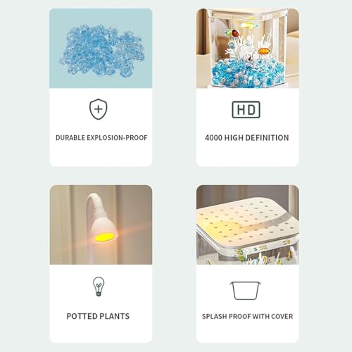 - YELLOWISH LED WARM LIGHT FOR AESTHETIC APPEAL: A built-in LED light casts a cozy, warm yellow glow inside the tank, beautifully highlighting the fish and ornaments. It enhances the atmosphere with a soft, romantic feel, day or night.