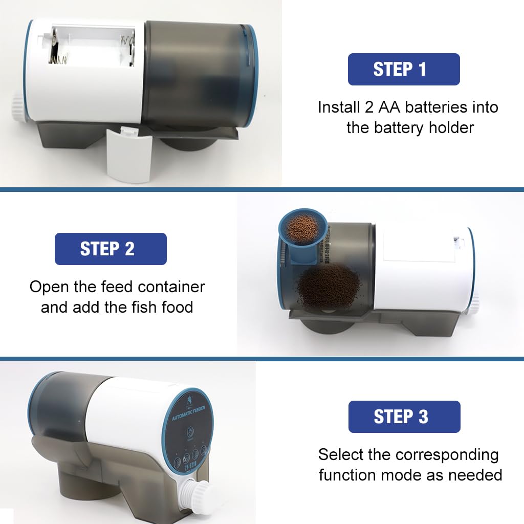 - It features a programmable timer offering four flexible feeding intervals to suit different aquarium schedules.