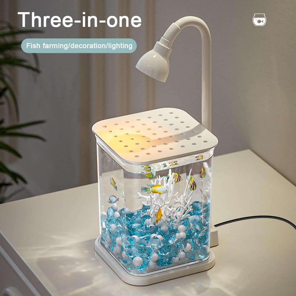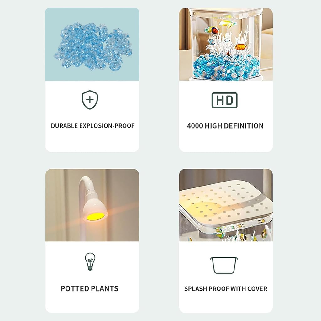 • Decorative blue pebbles and faux coral ornaments create a relaxing aquatic scene.
