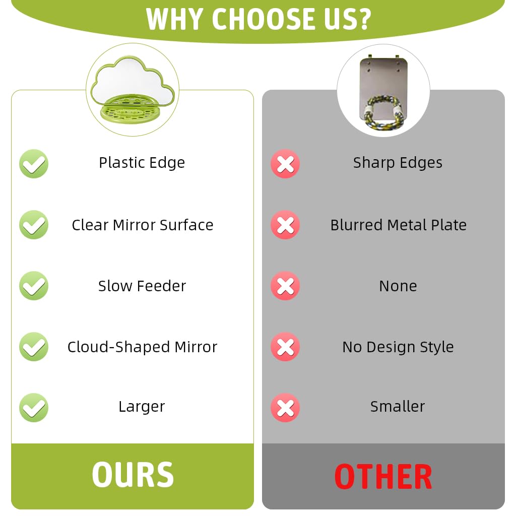 • 2-in-1 design combines a mirror and a food box for multifunctional enrichment.