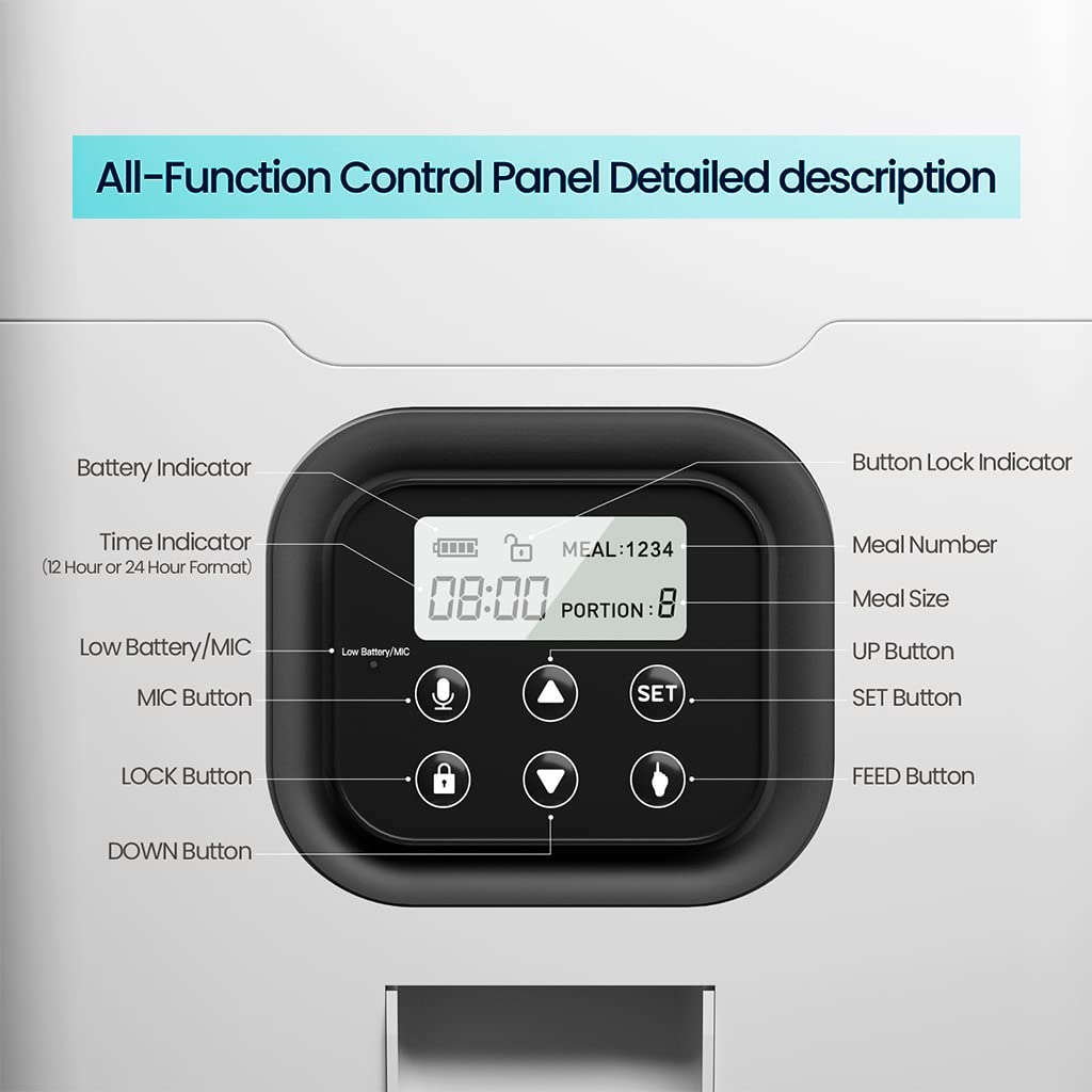 • Built‑in voice recording function plays the owner’s message to comfort and remind pets at meal times.